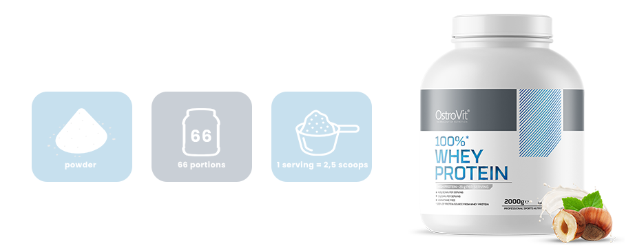 OstroVit 100% Whey Protein to najwyższej jakości odżywka białkowa zawierająca 70% protein. Ten suplement diety jest odpowiedni dla wszystkich sportowców, niezależnie od uprawianej dyscypliny sportowej. Szczególnie polecany jest w okresie budowania masy mięśniowej, jak i redukcji tkanki tłuszczowej. Może być stosowany w czasie zaawansowanych treningów, ale również jako składnik codziennej diety, w celu uzupełnienia wartości odżywczych.